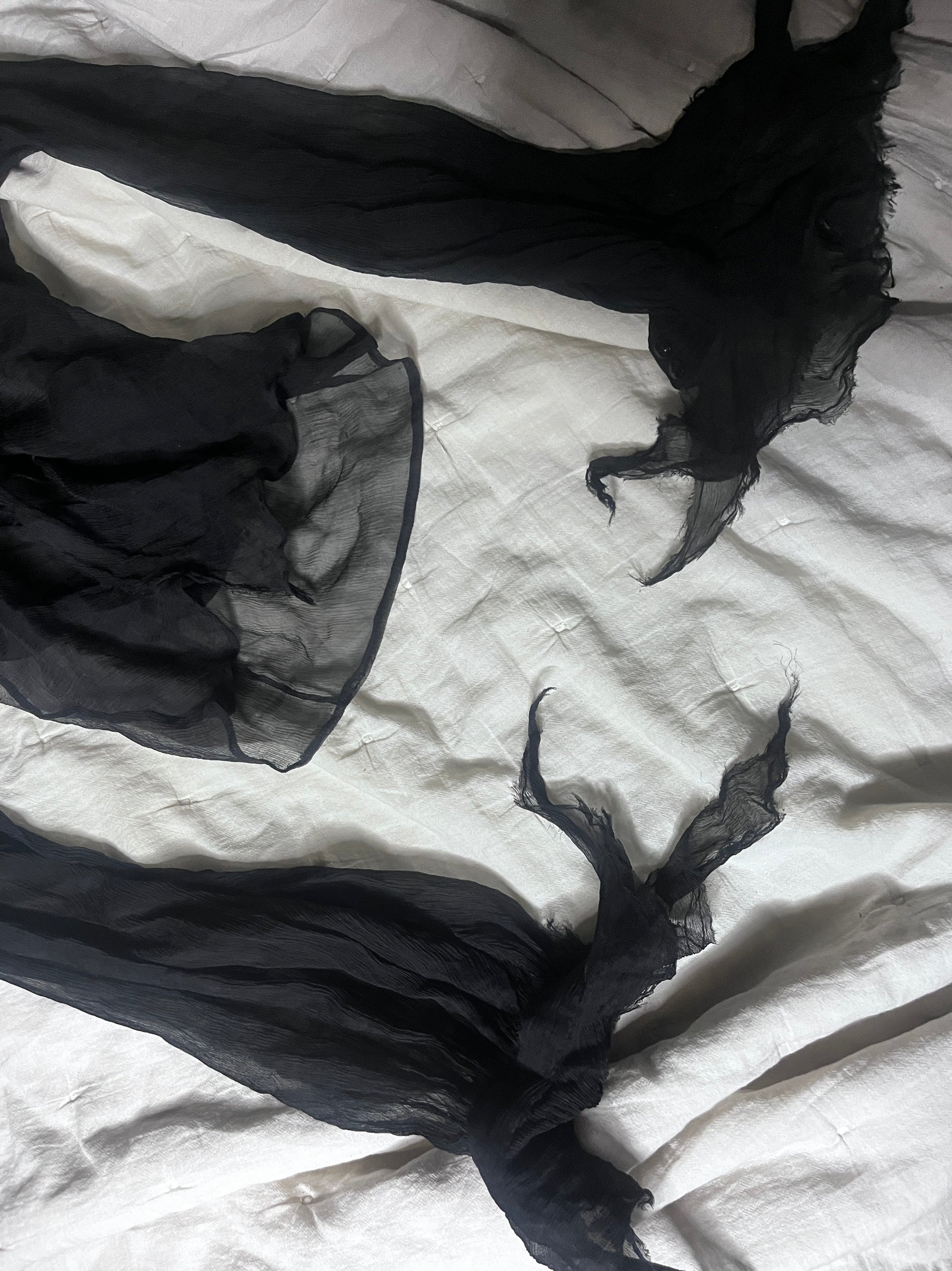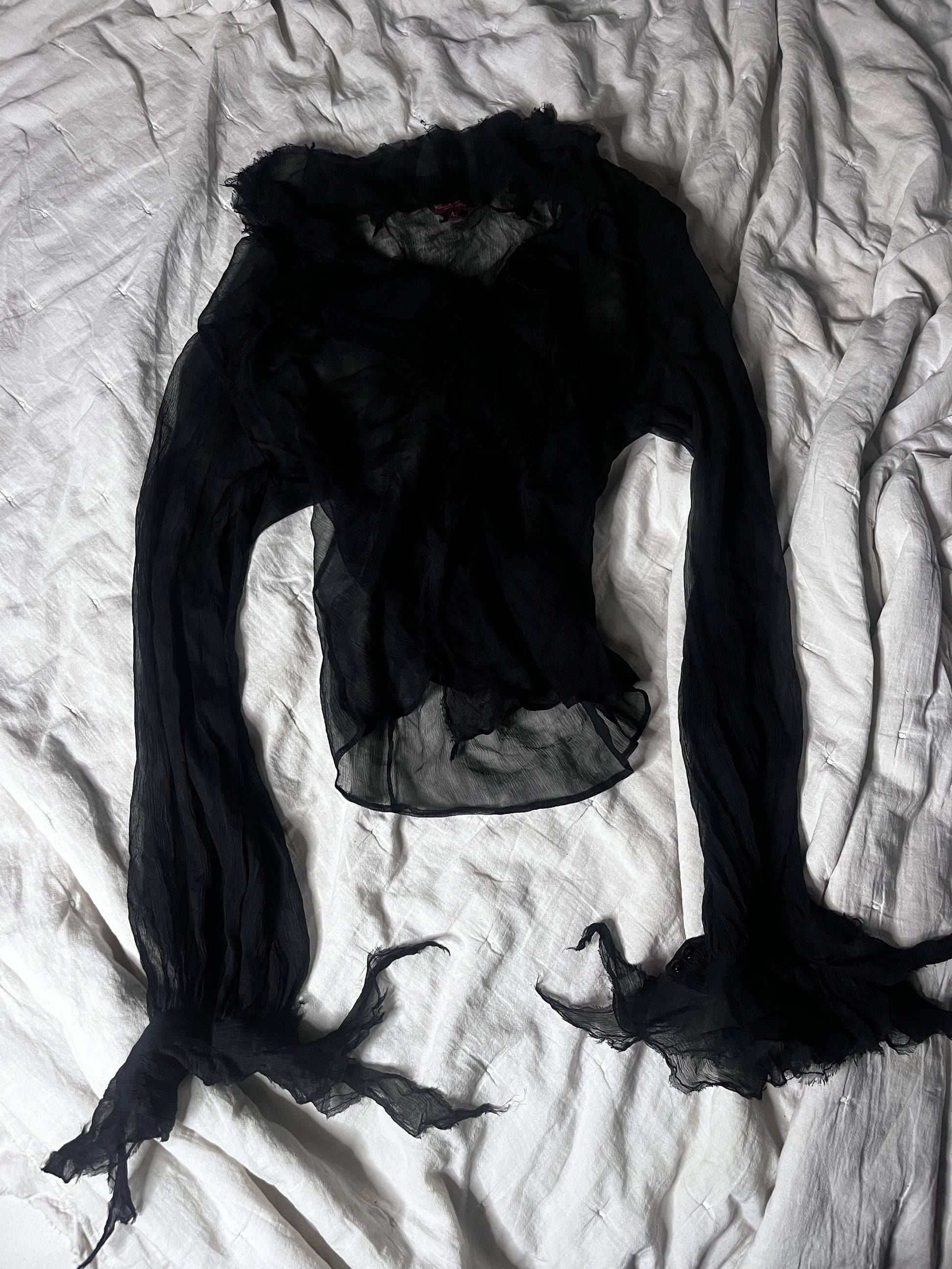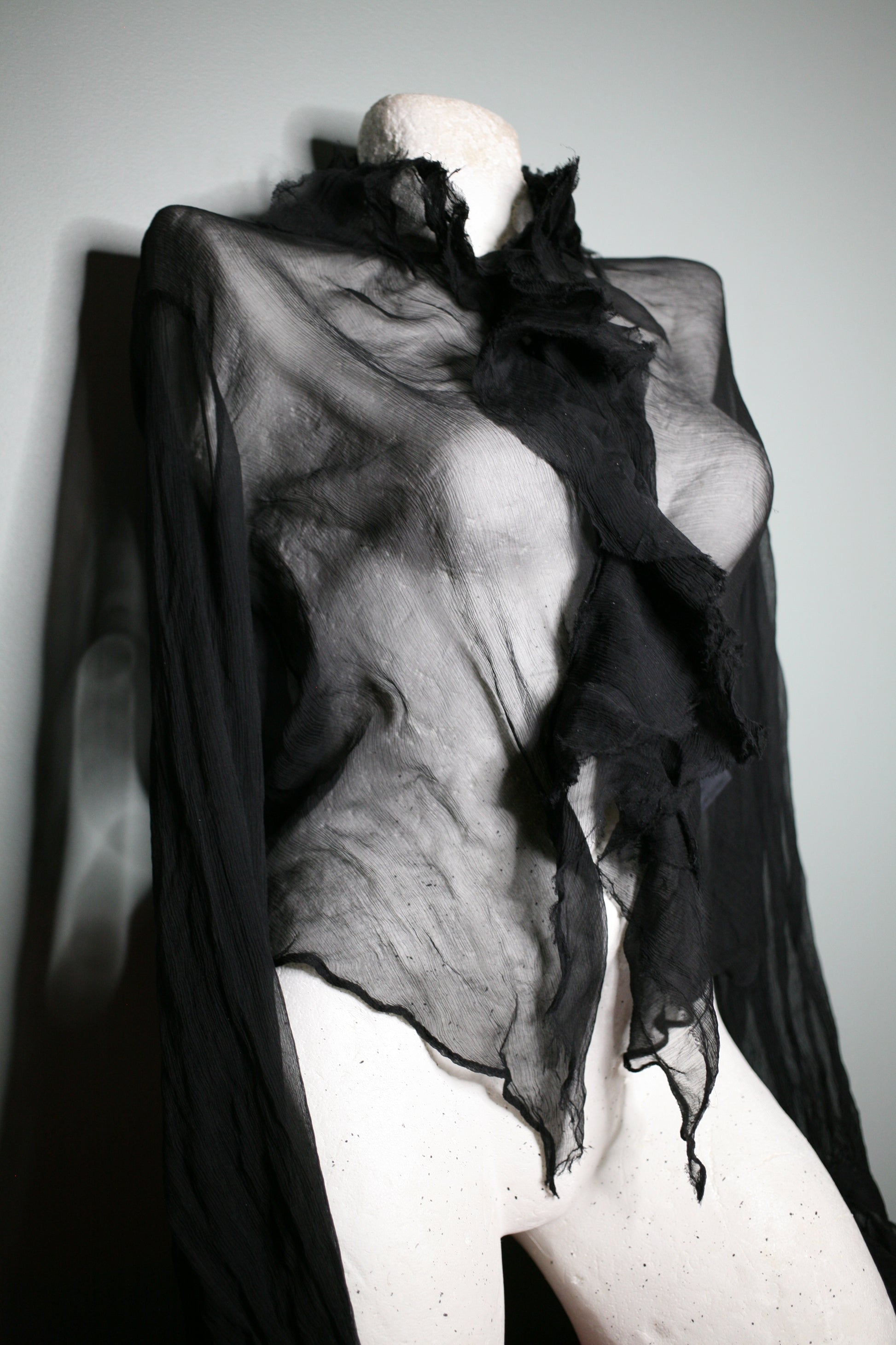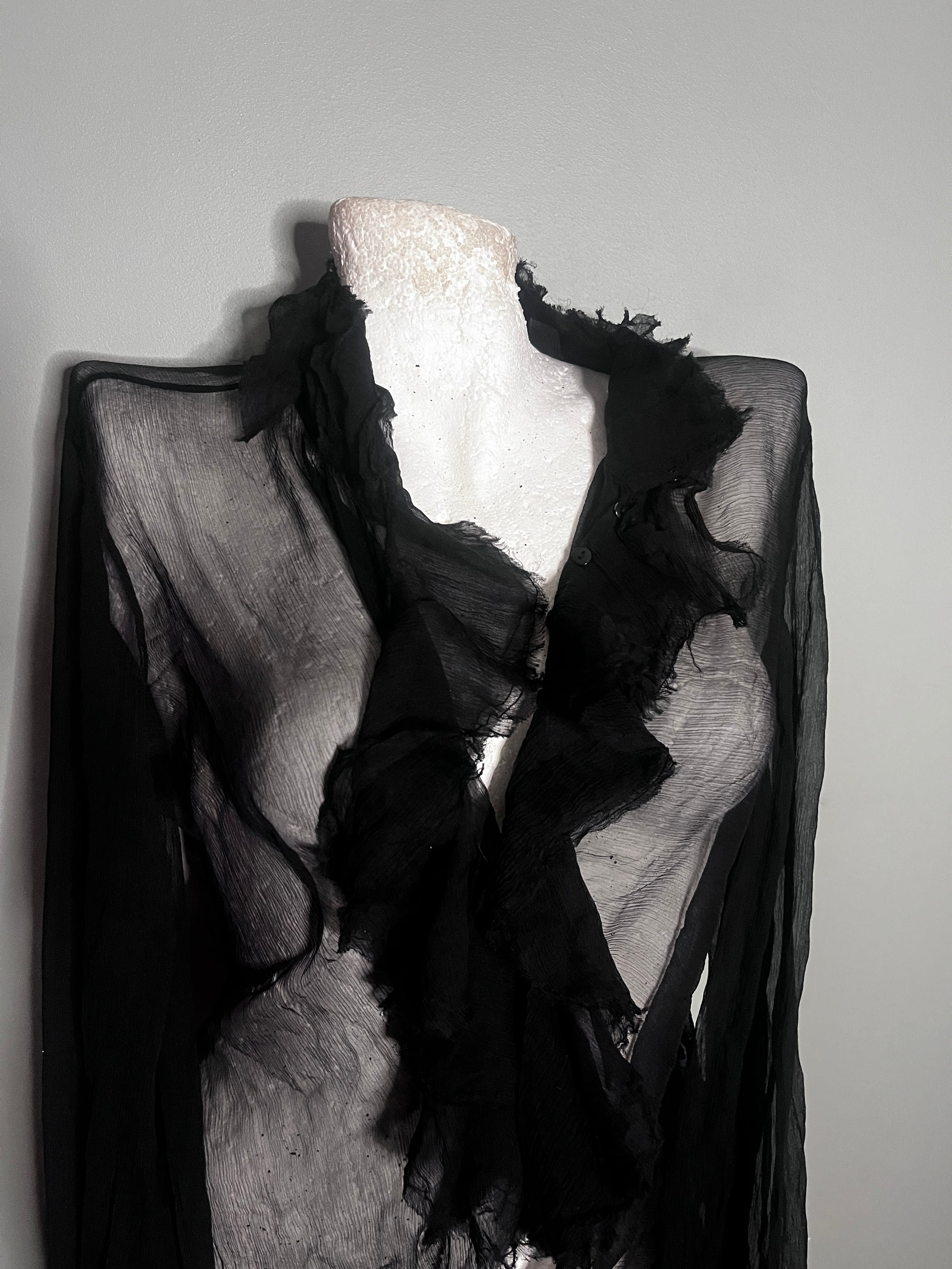 A sheer black silk garment with a sculptural, almost ceremonial silhouette.