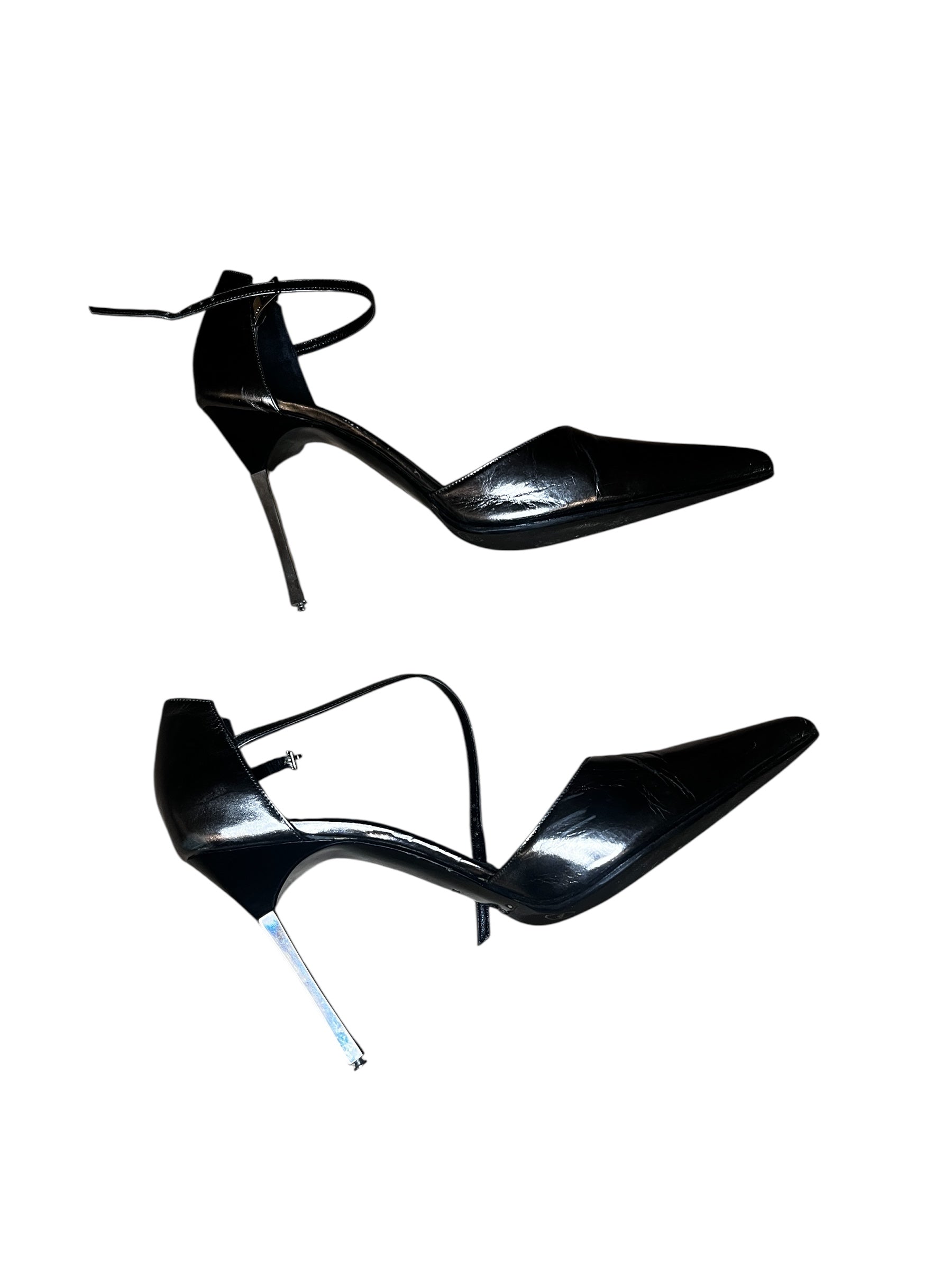 Sort, speilblank overflate. Skulpturell metallhæl. Delikat ankelstropp. En silhuett som er både sensuell og arkitektonisk – skapt for å bære i bevegelse, men også for å stå som et samlerobjekt.